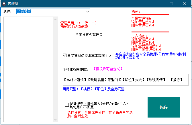 【选中群】更改不同的群,可分别设置全局/分群的管理员